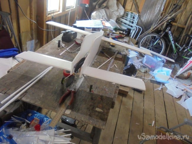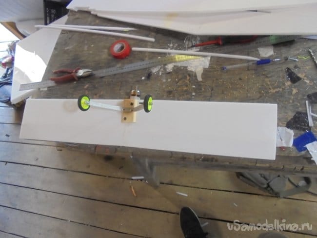 Я и раньше строил авиамодели по схеме тандем, но эта модель привлекла моё внимание прежде всего простотой конструкции. Тут нет профильных, сложных крыльев, да и фюзеляж представляет собой обычную коробку с укреплённой на ней кабиной. Крылья, хвостовое оперение и винглеты делаются из двух слоёв потолочки. Лёгкие колёса покупались , а стойки для шасси сделаны из полоски алюминия сечением 2 х 1,5 мм. Колёса закреплены на стойках длинными болтиками с гайками.