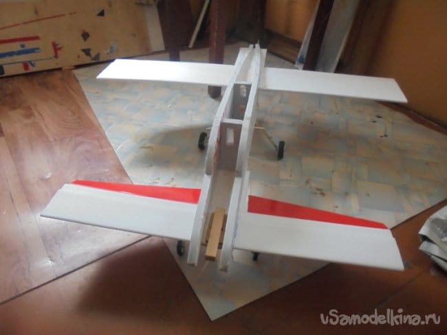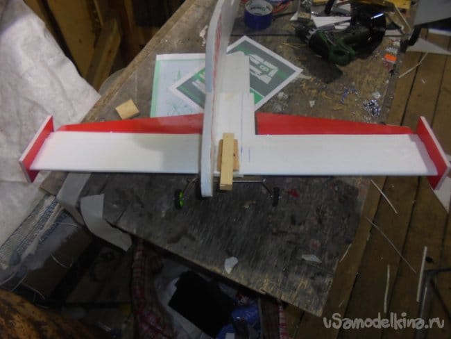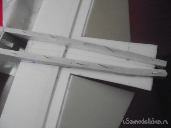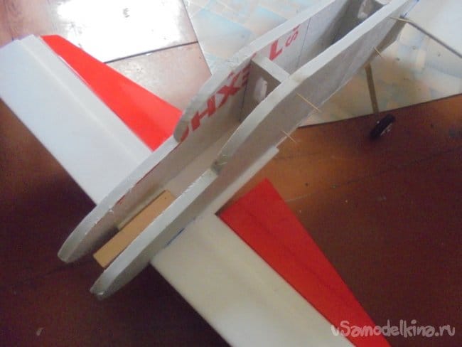 Готовые крылья устанавливаю на фюзеляж. Заготовки крыла сгибаются и между ними вклеивается деревянная рейка по всей длине крыла. Так делается и на переднем и на заднем крыле.