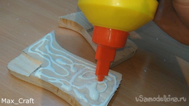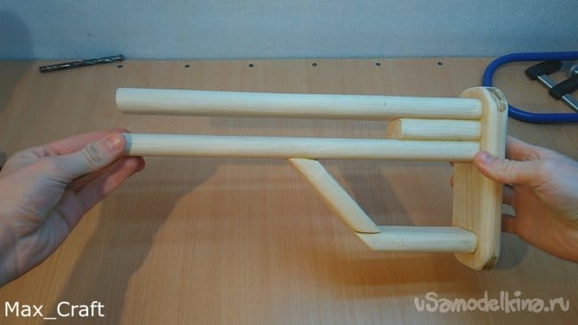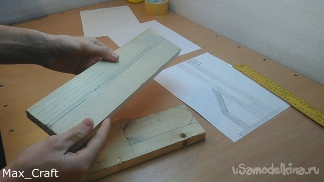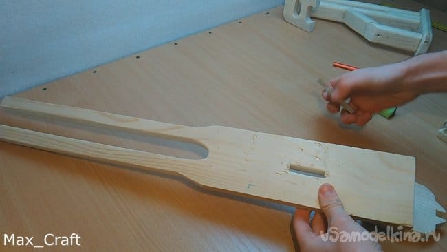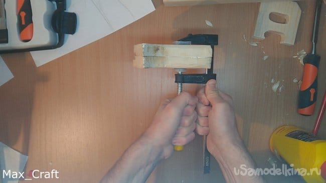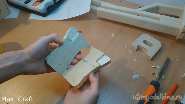Шаг 2: Далее из доски вырезаем 2 вот таких накладки. Это будет рукоять. Стамеской проделываем пазы, как на фото, они нужны для того, чтобы курок нажимался и имел " ход". Столярным клеем склеиваем их друг с другом, и стягиваем струбциной.