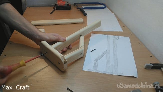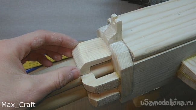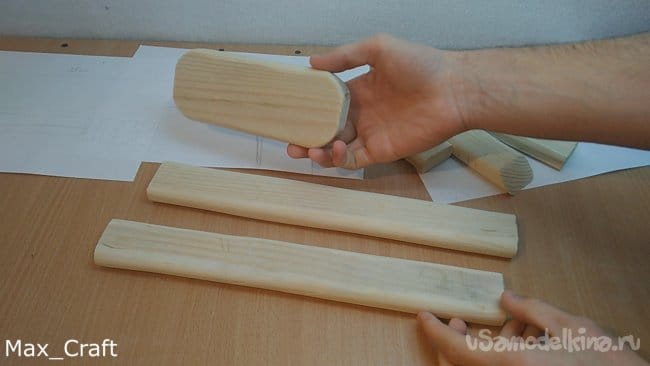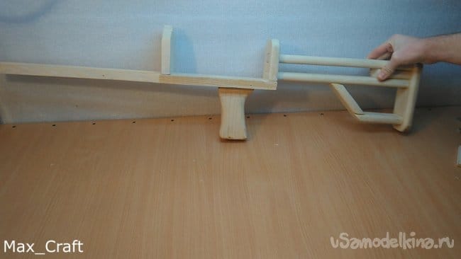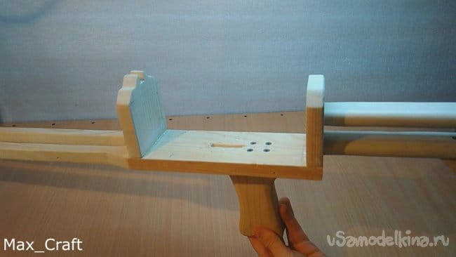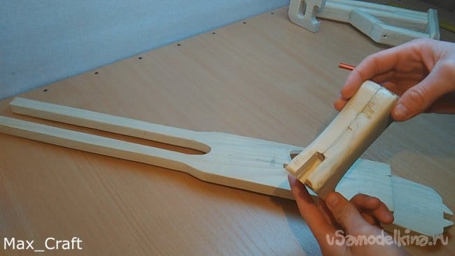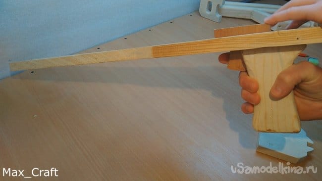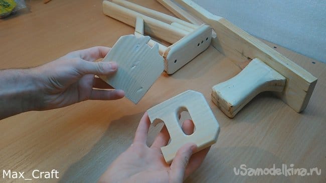 Шаг 1: Изготавливать резинкострел я решил с приклада. Все детали будут делаться из доски толщиной 20 мм. Повторюсь, чертежей нет, все " на глаз". После того как вырезали все нужные детали, приступаем к сборке. Соединял я детали Столярным клеем и саморезами.