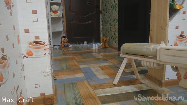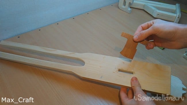 Шаг 3:Из той же доски вырезаем вот такую деталь, как на фото. Она будет "основанием", так как все детали будут крепиться к ней. Далее проделываем небольшой паз под курок. Курок я вырезал из куска ламината. И затем приклеиваем ранее сделанную рукоять и для надёжности вкручиваем 4 самореза.