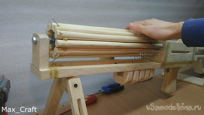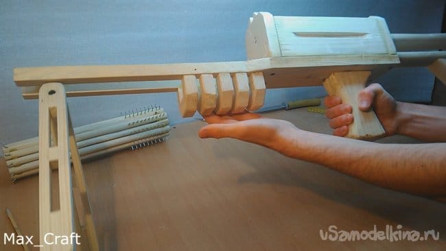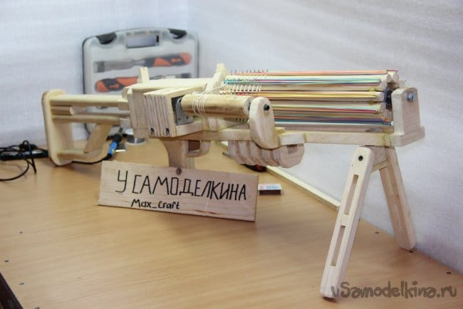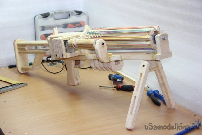 Приятного времени суток, Господа! В этой статье я вам расскажу и покажу, как я сделал вот такое чудо-оружие из дерева. С названием я так и не определился, то ли это пулемёт, то ли минига, но это не суть. Главная его задача это стрельба резинками, с которой он справляется на ура. Данное самоделка не представляет никакой опасности для людей и животных, ведь это резинкострел. На его создание я потратил почти месяц, выпиливая, собирая, и склеивая по вечерам этот агрегат. Чертежей я практически не делал, были только небольшие наброски карандашом на листе А4. Все было в голове и делалось "на глаз" (да простят меня инженеры). На данный пулемёт я заряжал 130 резинок, но можно зарядить в 3 раза больше, если зарядить не в один ряд, а в 3. Ну ладно, пора приступать к показу и рассказу, ведь статья получится не маленькой.