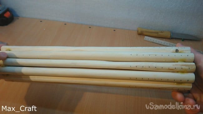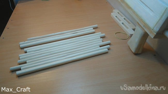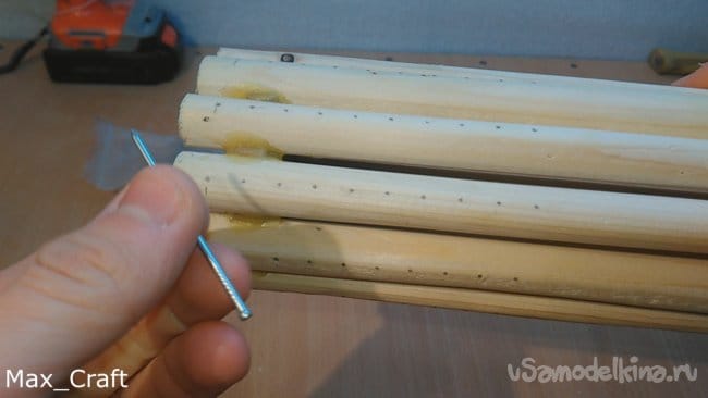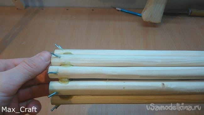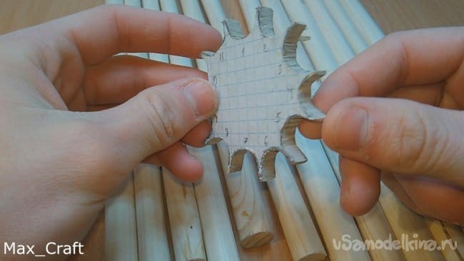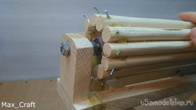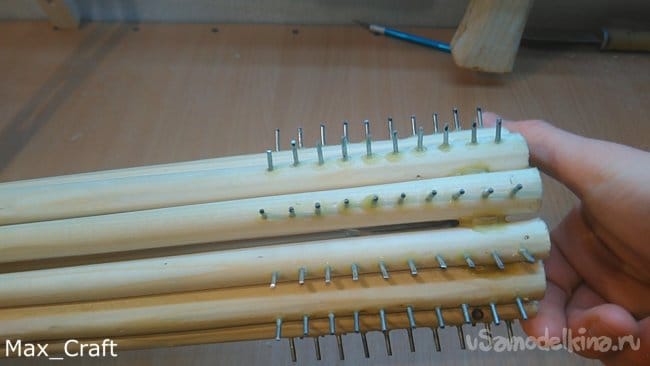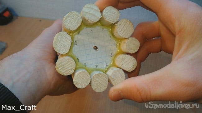 Шаг 7: Далее я сделал 11 вот таких вот палочек. Длинна их чуть больше, чем длинна натяжки резинки. Затем из ламината я вырезал две вот таких вот звёздочки. Столярным клеем приклеил все палочки на звезду, и получился вот такой вот барабан. Палки нужно сделать как можно ровнее и "круглее", чтобы они плотно приживались к звёздочке. Затем сделав разметку, я просверлил отверстия под гвоздики, затем вклеил их и укоротил для нужной длинны - 8-10 мм.