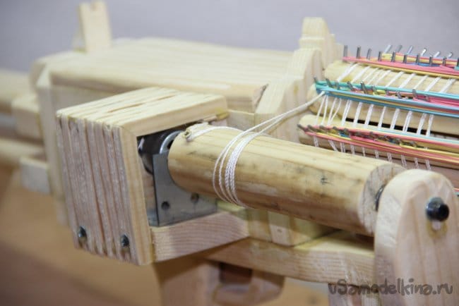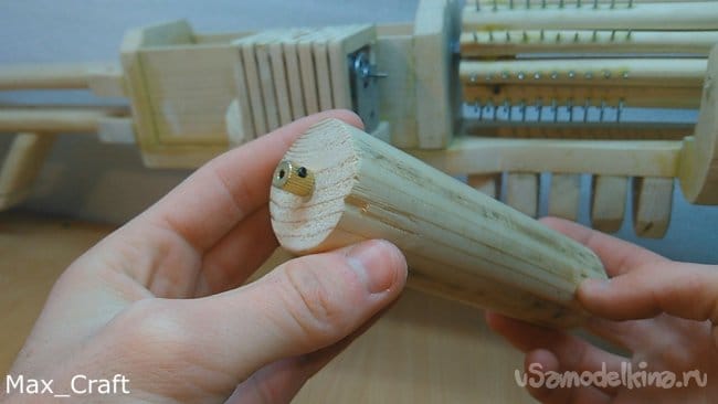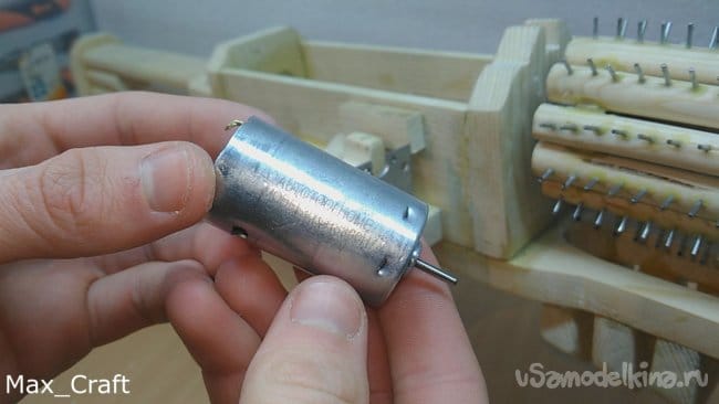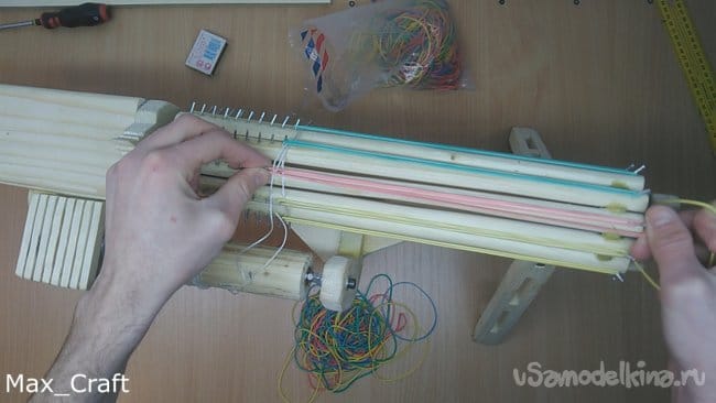 Шаг 13: Закрепляем капроновую нитку на крутящий валик и можно приступать к заряжанию резинок. Всё довольно просто и легко, но немного долго. Как правильно заряжать можно посмотреть в моём видео. Так же скорость выстрела резинок можно увеличить или уменьшить, покрутив болтик на понижающем модуле. Проще говоря, прибавить или увеличить обороты моторчика.
