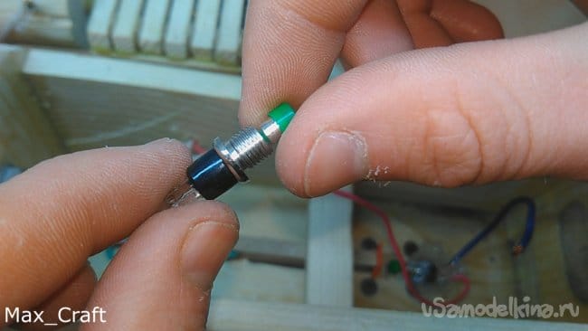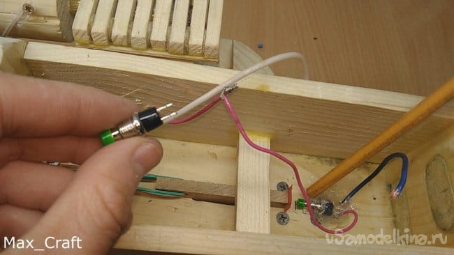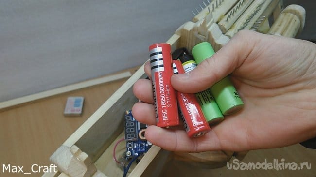 Шаг 12: Приступаем к сборке электрики. Я взял вот такую кнопку, и приклеил термо клеем на своё место, так чтобы курок при нажатии пальцем, нажимал на эту кнопку. Возвращают курок в исходное положение несколько резинок. Приклеенный сверху брусочек не даёт курку подняться вверх. Затем собираем простенькую схему, которая включает в себя моторчик, кнопку, коробку под аккумуляторы 18650 и понижающий модуль. Все комплектующие я заказывал на всем известном китайском магазине. Так как моторчик на 12v, а четыре аккумулятора это почти 15V, понижающий модуль обязательно нужен, тем более им можно регулировать обороты моторчика, и следовательно скорость выстрела резинок.