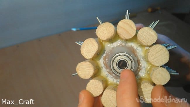 Шаг 10: В цилиндрический брусок в один торец вклеиваем небольшой подшипник, а с другой стороны вклеиваем патрон, который шёл в комплекте с моторчиком. Затем устанавливаем патрон на вал моторчика, а в подшипник вставлен болт.