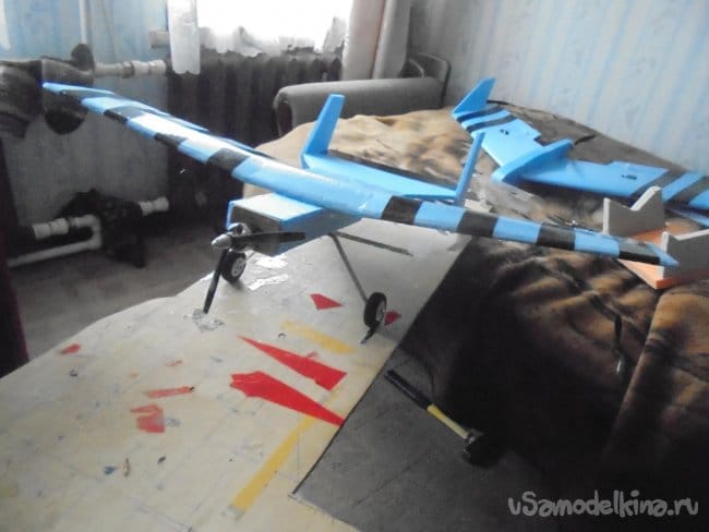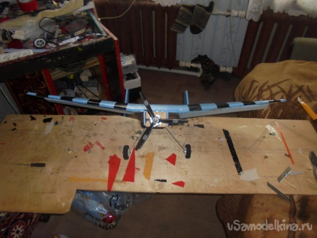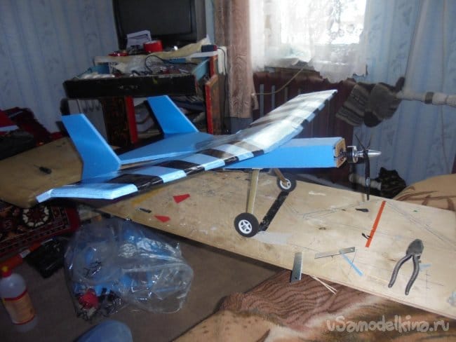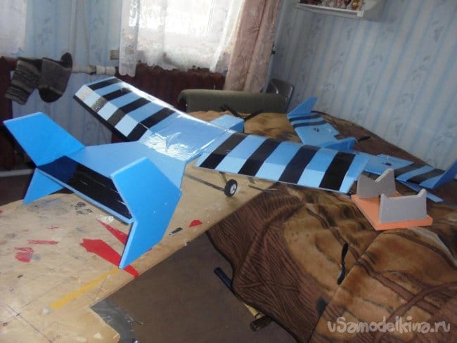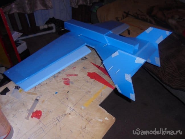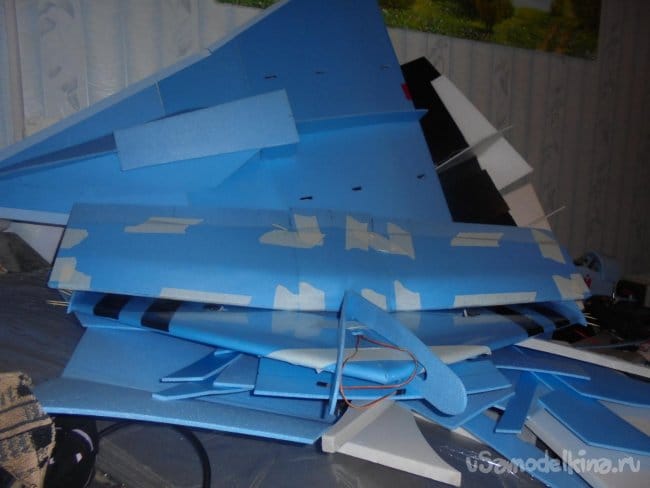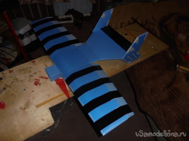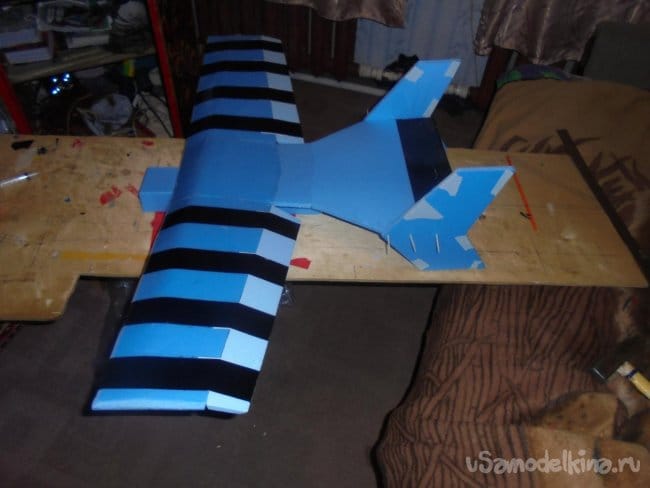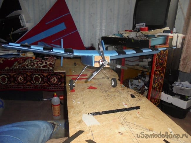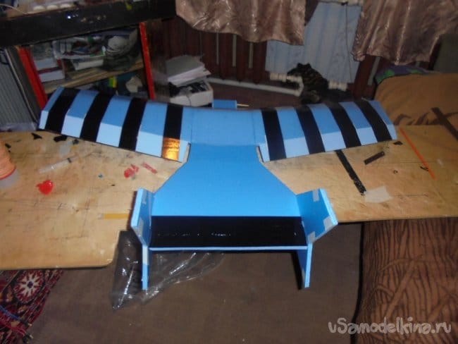 В процессе работы, обтягиваю модель цветным скотчем. Ставлю сервомашинки, навешиваю элевоны, вклеиваю кабанчики, подсоединяю тяги.