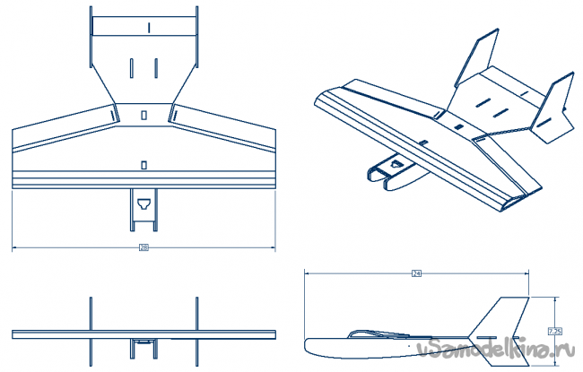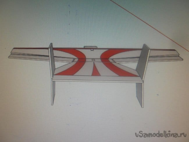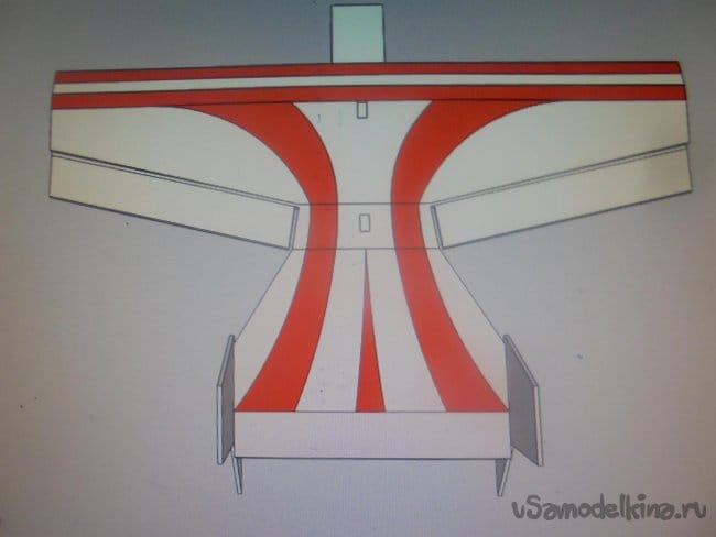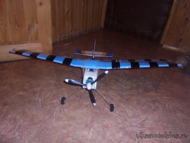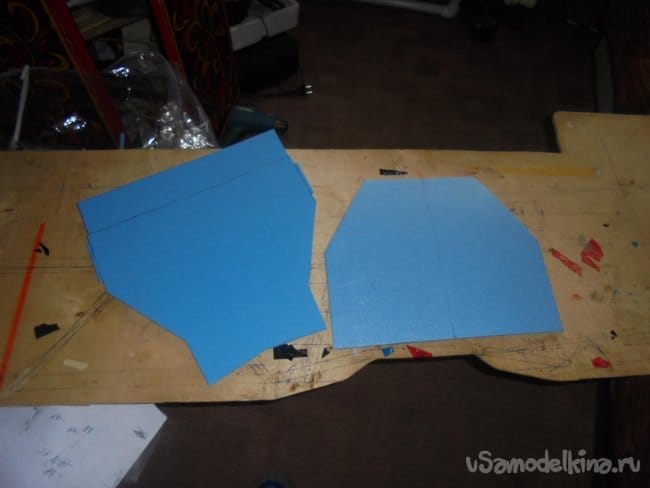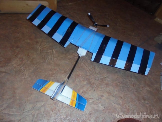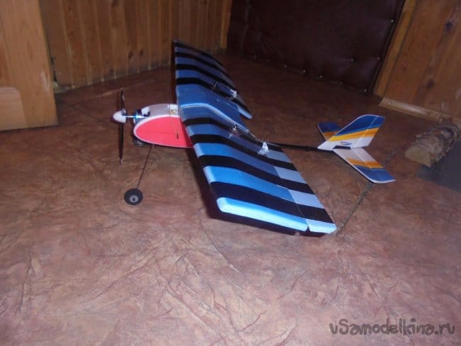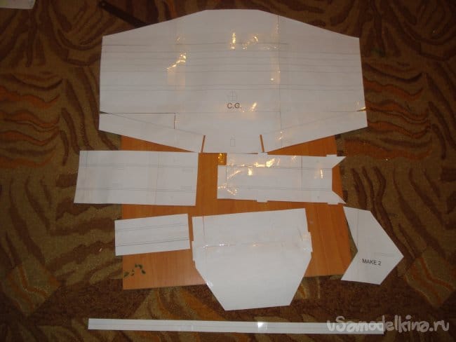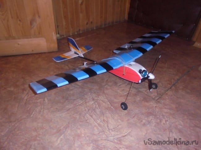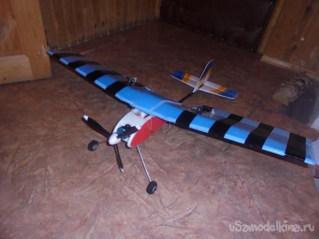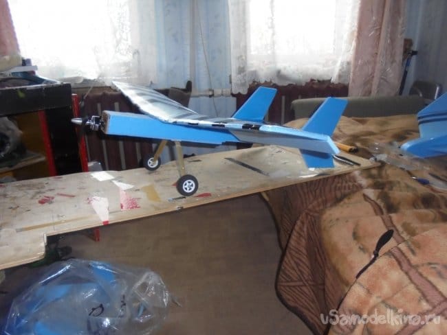 В процессе работы, обтягиваю модель цветным скотчем. Ставлю сервомашинки, навешиваю элевоны, вклеиваю кабанчики, подсоединяю тяги.