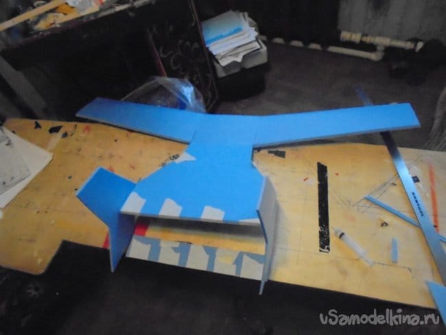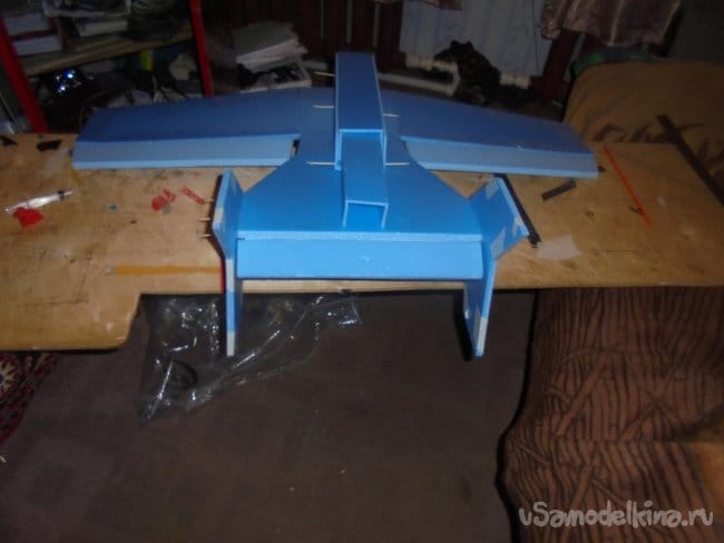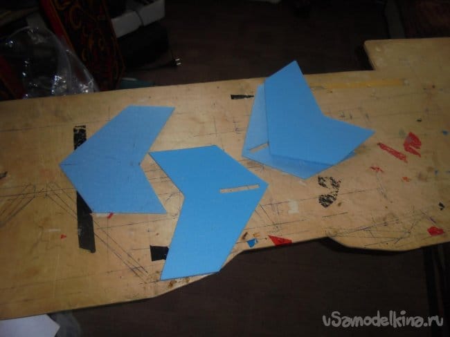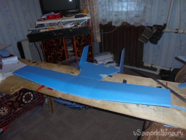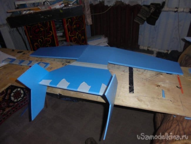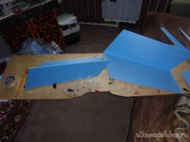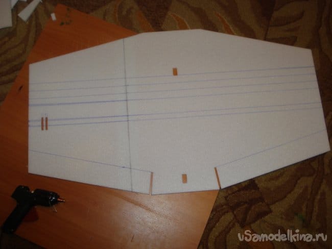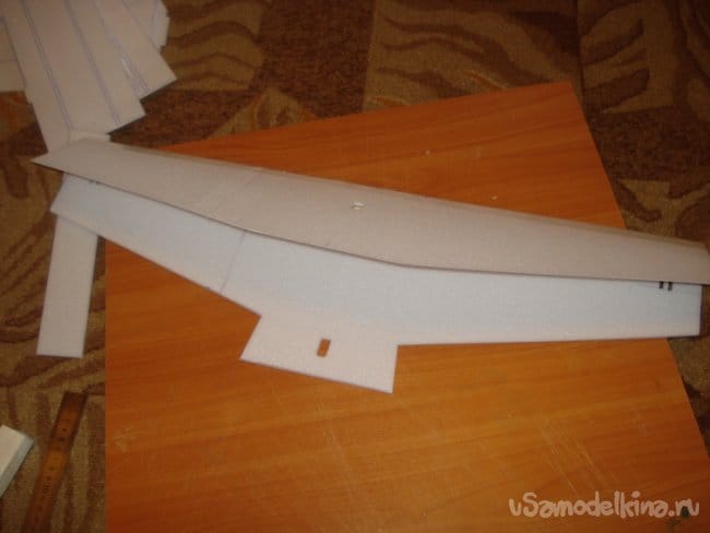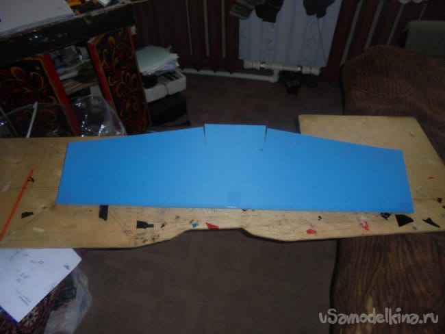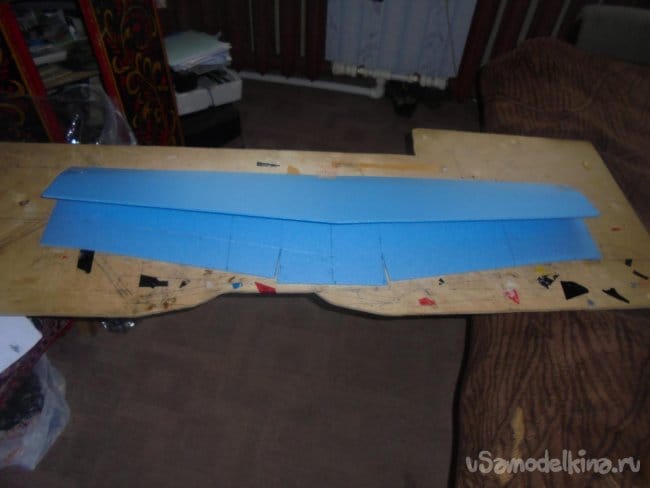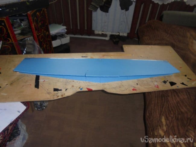 Крыло у меня не вызвало никаких затруднений. Сгибаем заготовку, внутри предварительно вклеив лонжерон из полосы утеплителя, по всей длине крыла и склеиваем.