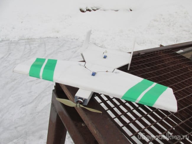 Нижняя часть фюзеляжа после установки электроники и аккумулятора вставляется в верхнюю , стационарную часть и фиксируется деревянными шпильками.- зубочистками.