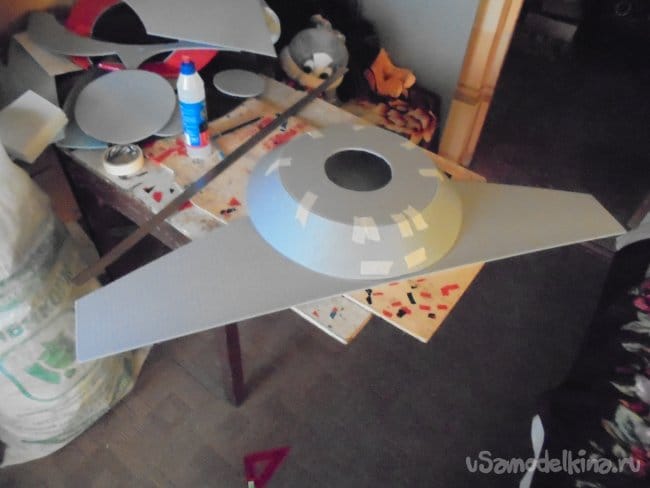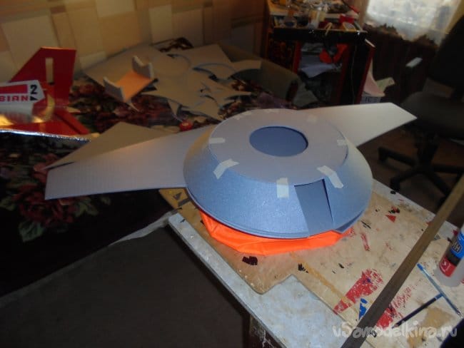 Дальнейший монтаж тороидальной части фюзеляжа на несущую поверхность, между крыльями.