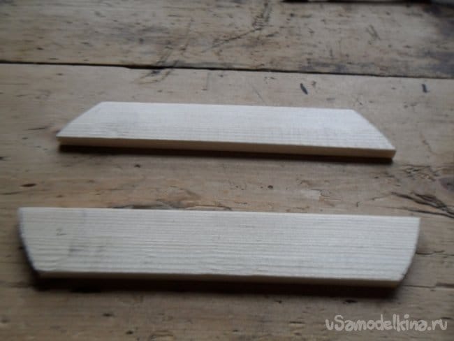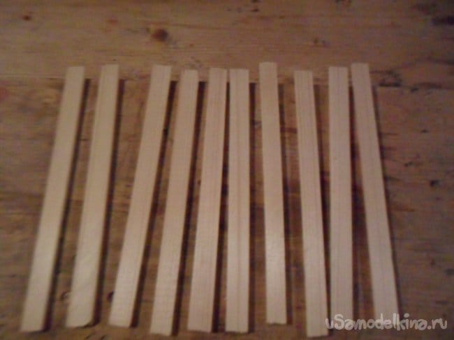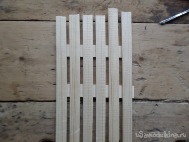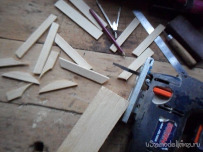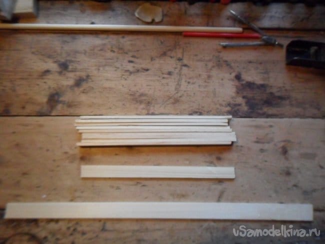 Распиливаем доску по всей ширине на рейки толщиной 6 мм (одна из них будет длиннее и шире остальных) и фугуем их шероховатые стороны. Получились рейки толщиной 5 мм.