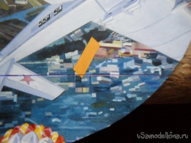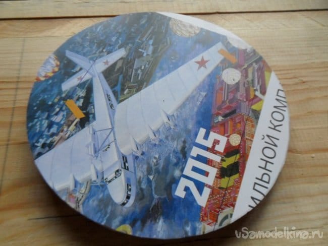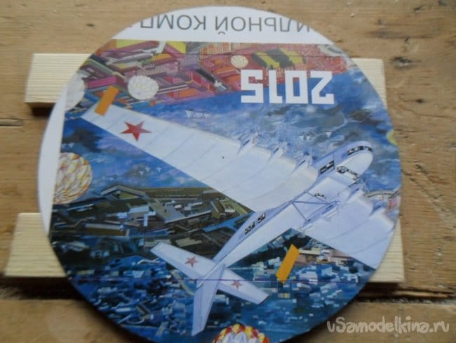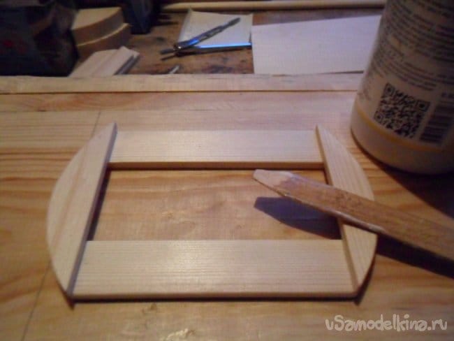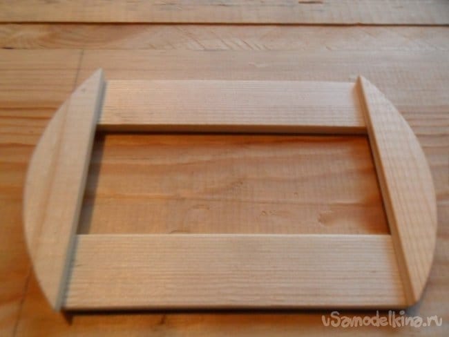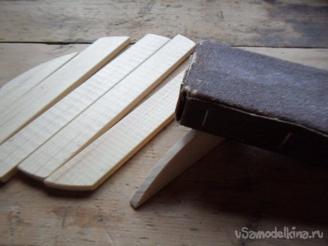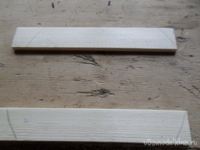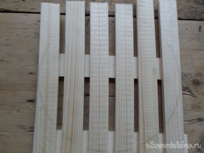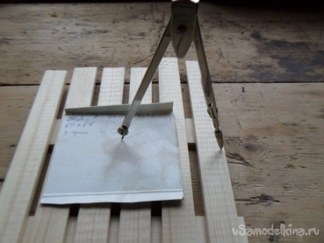 Подставка будет круглой формы, поэтому перед началом отпиливания торцов следует начертить на выставленных в нужном расположении рейках окружность радиусом 7 см. Чтобы игла циркуля не оставила вмятину в дереве, а также чтобы не сдвинулись заготовки, подкладываем под нее кусок картона (можно использовать и лист фанеры, ДВП или другой плотный материал). Проводим окружность.