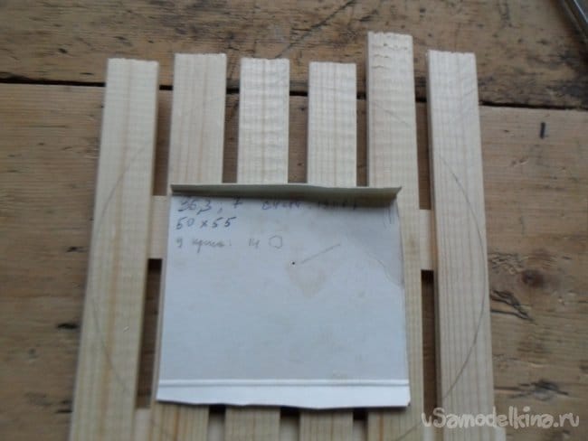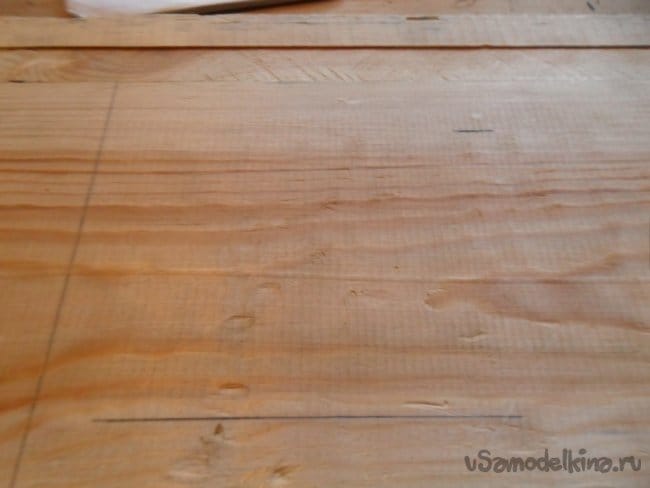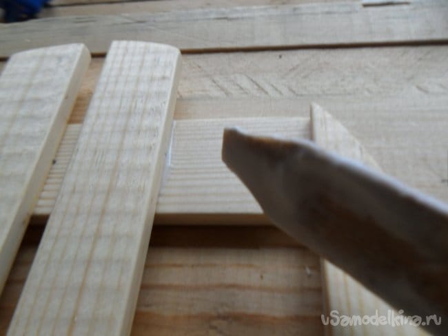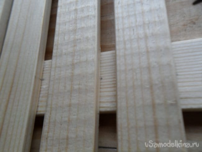 На случайно взятой, но подходящей доске проводим линии, относительно которых будут располагаться широкие рейки. Выставляем их правильно, смазываем столярным клеем и прикладываем сверху две боковые узкие рейки. Прижимаем конструкцию чем-либо тяжелым.
