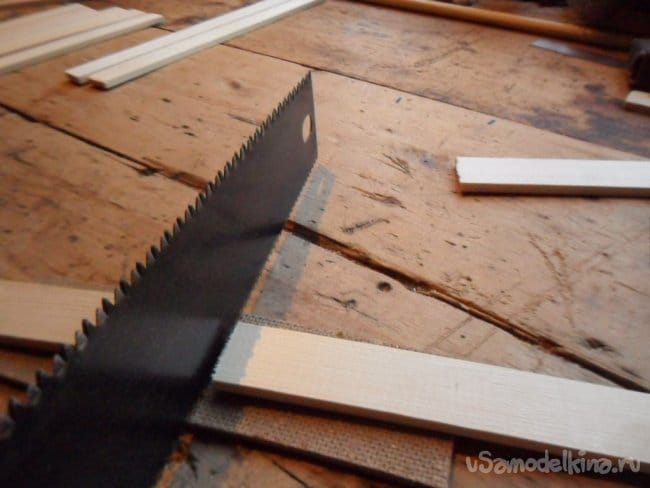 Широкую рейку распиливаем ножовкой на две части: на них в дальнейшем будут располагаться остальные (узкие) рейки.