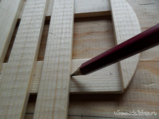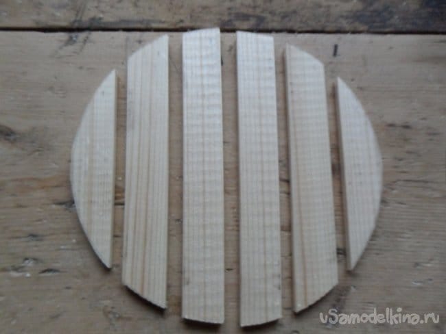 Теперь необходимо очертить границы на двух широких рейках. Для этого сначала вырезаем круг из картона с радиусом, равным радиусу подставки. На круге проводим две параллельные хорды симметрично относительно его центра на определенном расстоянии 10 см друг от друга. На две рейки кладем данный круг и выставляем их таким образом, чтобы линии находились строго над внешними боковыми сторонами деталей. После этого на опорах обводим карандашом круглый картон. Все деревянные составляющие подставки готовы для отпиливания.