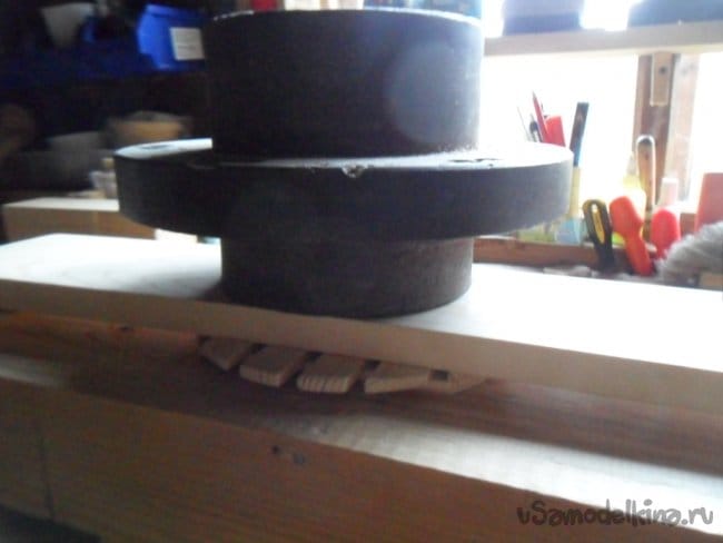 Теперь, беря поочередно каждую узкую рейку и смазывая клеем, прикладываем их к широким заготовкам. Сверху кладем доску, а на доску – железный массивный цилиндр с кольцом вокруг и оставляем всю конструкцию на некоторое время (полчаса - час).