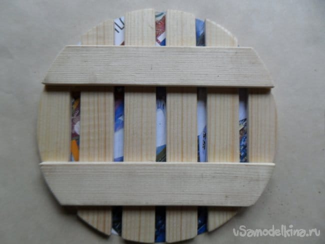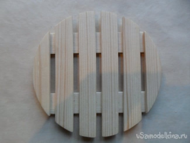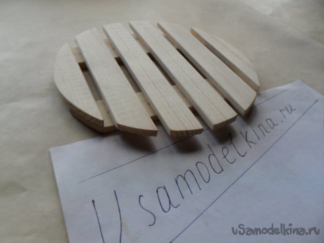 На платформу из четырех реек раскладываем остальные детали, а сверху прикладываем бумажный круг, который поспособствует выравниванию брусков. В результате такого выравнивания получается полуготовая подставка достаточно круглой формы. Убрав круг, карандашом помечаем на широких и узких рейках места короткими линиями, по которым можно будет правильно выставить узкие рейки при склеивании.