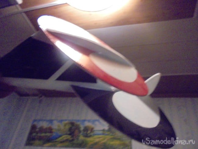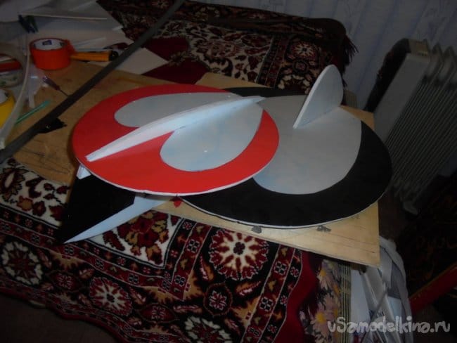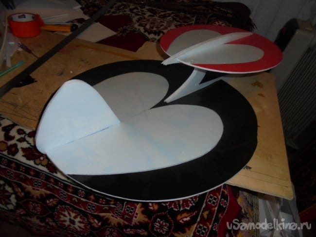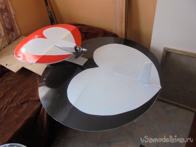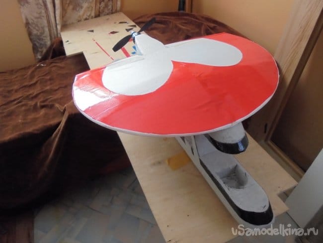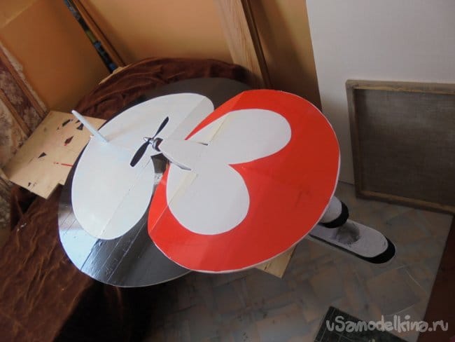Меньшее крыло делается также, как и большое нижнее крыло. На верхнем , малом крыле вырезаются элероны. Элероны навешиваются на двухсторонний скотч, путём вклеивания его между двух слоёв потолочки, из которых сделаны элерны и само крыло.