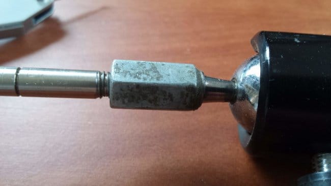 Накручивает гайку на резьбу держателя. С другой стороны, вкручивает шпильку. На шпильке устанавливает зажим с индикатором.