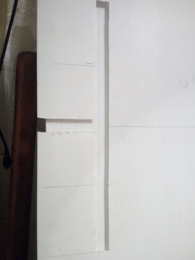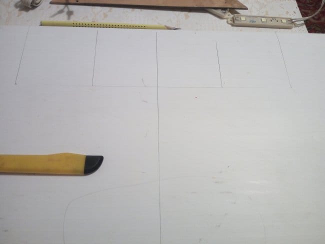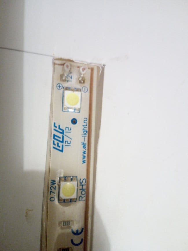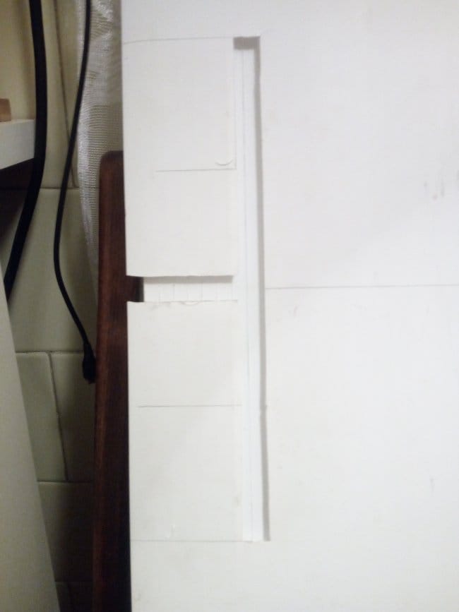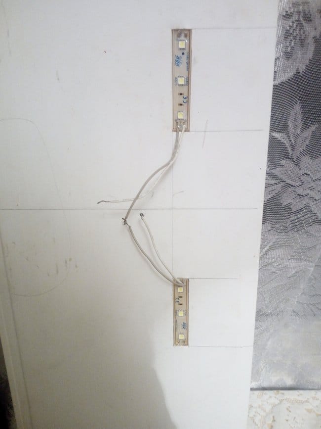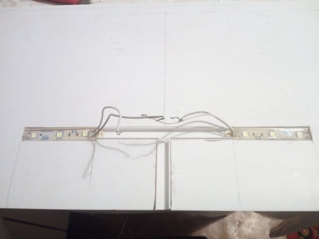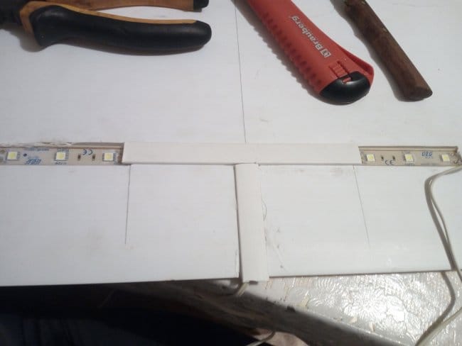 Следующим шагом стала подготовка посадочных мест для ламп. Для этого, с помощью канцелярского ножа, я вырезал в панели углубления. Срезал верхний слой ПВХ, внутреннее боковое ребро жесткости, оставил один слой как место наклейки ламп.