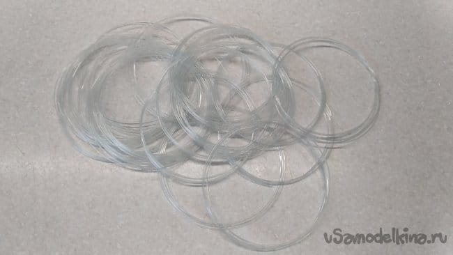 Из толстой лески нарезать куски длиной, равной двойному диаметру кольца - плюс 10 см. (в данном случае - 24 шт., по 1 м.).