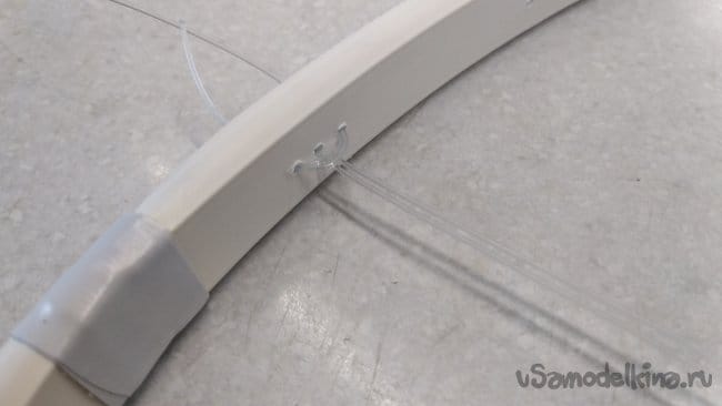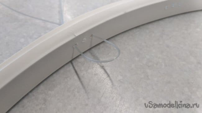 Сложив один из приготовленных кусков лески пополам, протащить леску через крайние отверстия с внутренней стороны кольца, начиная со стыковки вложенной внутрь, крышки кабель-канала.