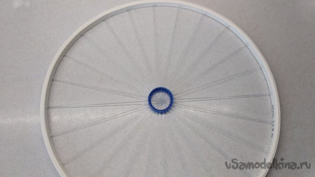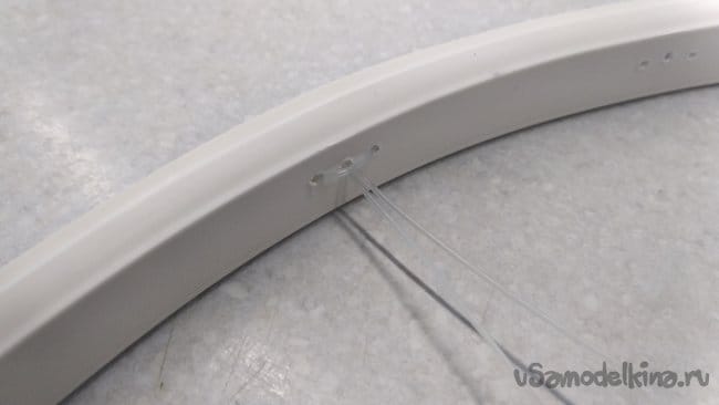 Теперь кончики лески протащить через соседние отверстия с наружной стороны кольца, не допуская перекручивания лески в «мягкой» спице, и далее с внутренней стороны кольца через отверстия с противоположных сторон.