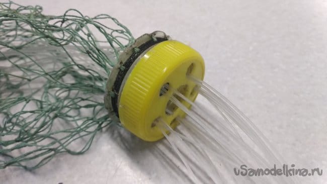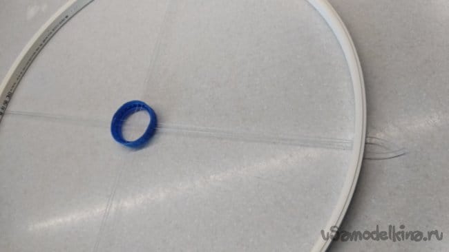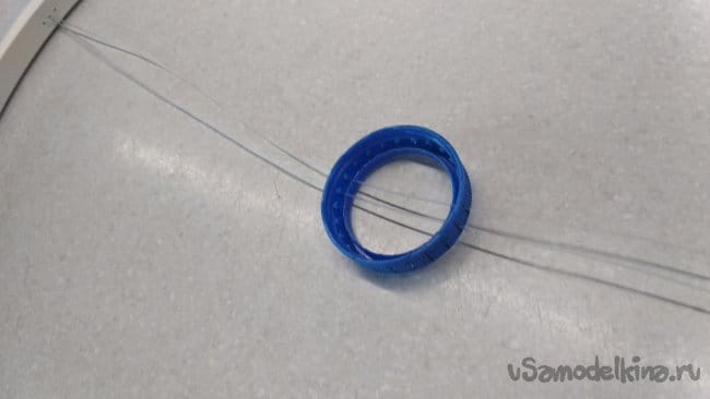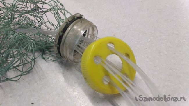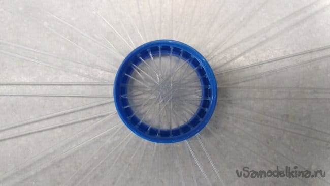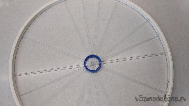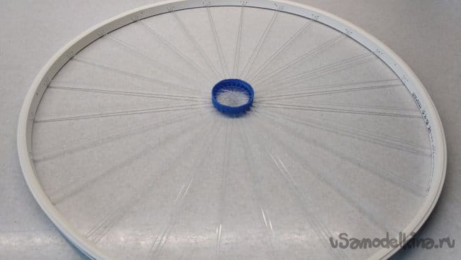 Так же следует поступить и с другими приготовленными кусками лески, начиная с расположенной на 90° по отношению к первой, уже закреплённой, для центровки внутреннего кольца, изготовленного из крышки от ПЭТ бутылки.