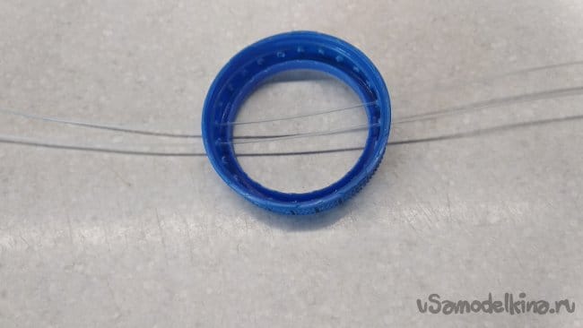 Далее протащить кончики лески через параллельные отверстия, по центру кольца, изготовленного из крышки от ПЭТ бутылки.