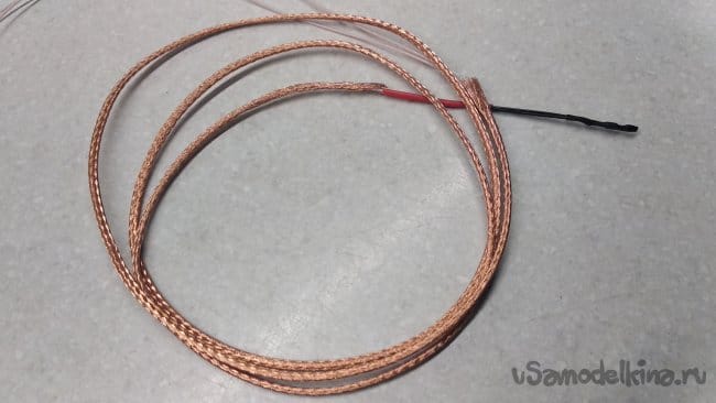 Вставить вовнутрь оплётки приготовленный теплостойкий провод МГТФ с датчиком на конце.