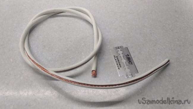 Лезвием безопасной бритвы, вдоль всей длины коаксиального кабеля, сделать надрез и снять наружную изоляцию.