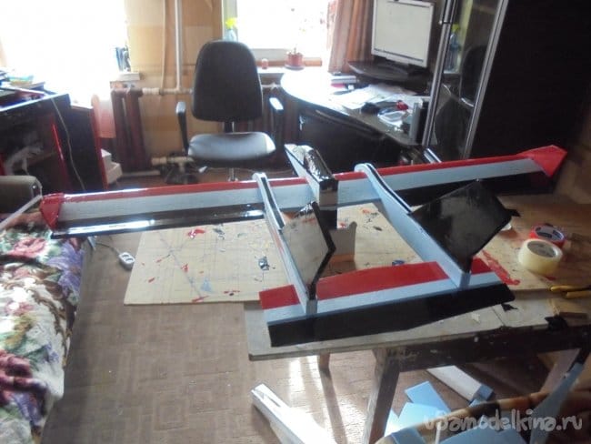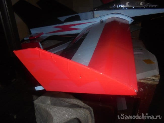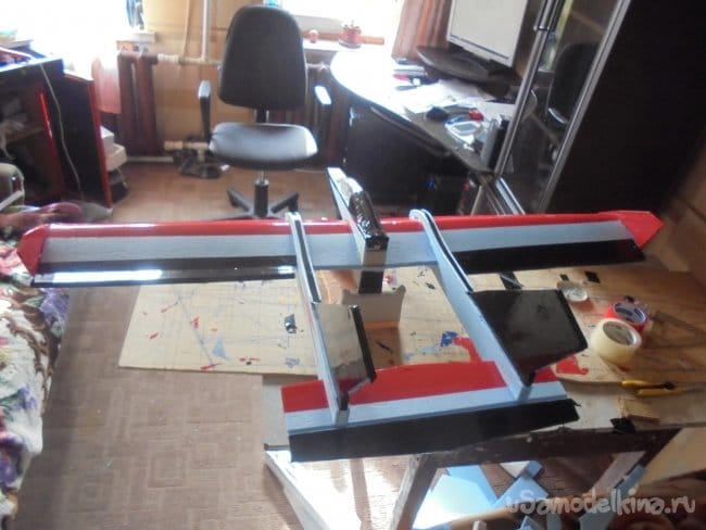 В хвостовой части балок сделал прорези для стабилизатора, на который навесил руль высоты. Все рулевые поверхности навешивались на двухсторонний скотч, меду двух слоёв которого вклеил плёнку от папки для бумаг - «Файл».