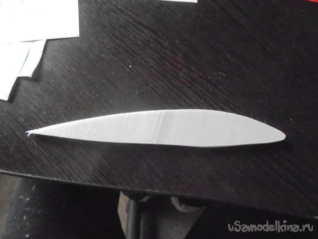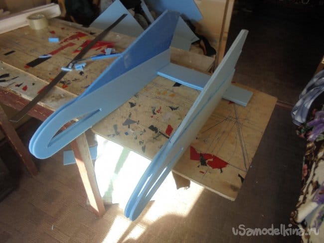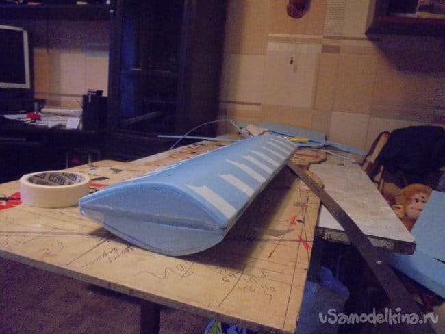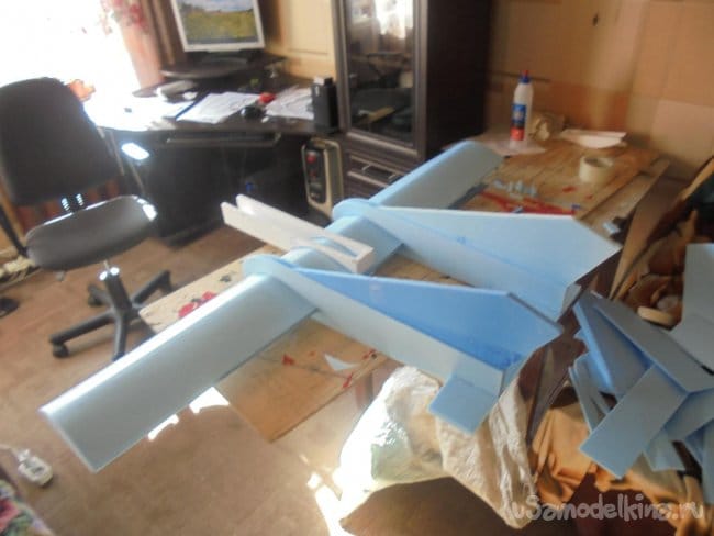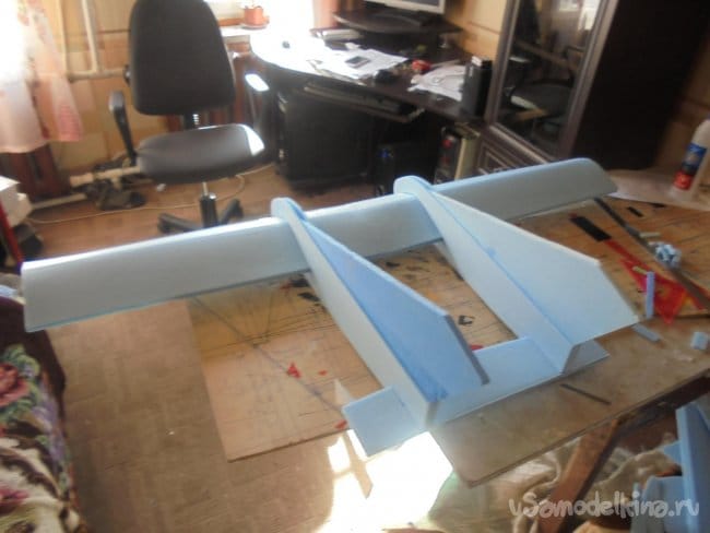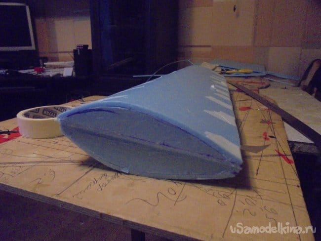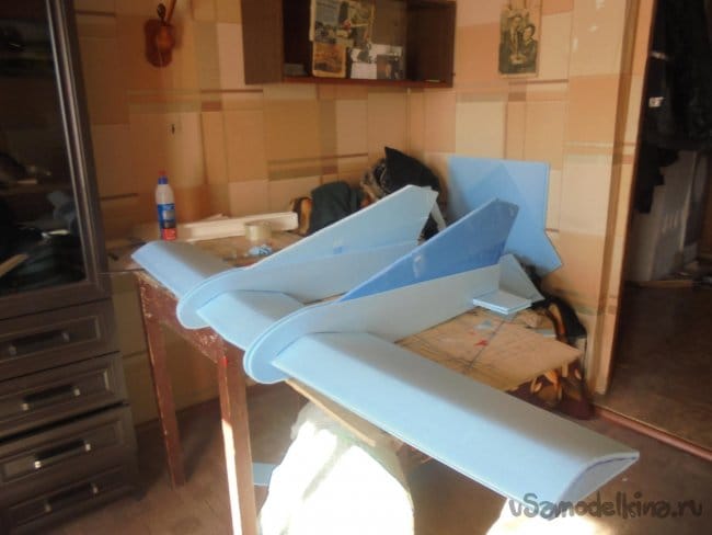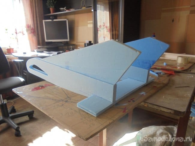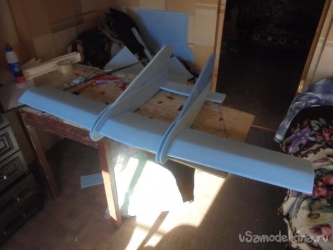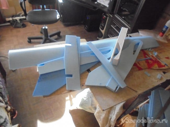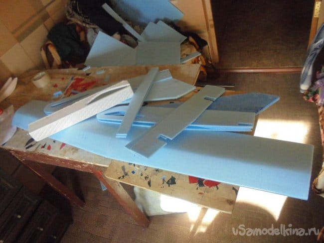 Для фюзеляжа хотел использовать технологическую пенопластовую упаковку для предохранения дверей при транспортировке. Но она показалась мне очень хрупкой, и я решил делать фюзеляж из подложки.