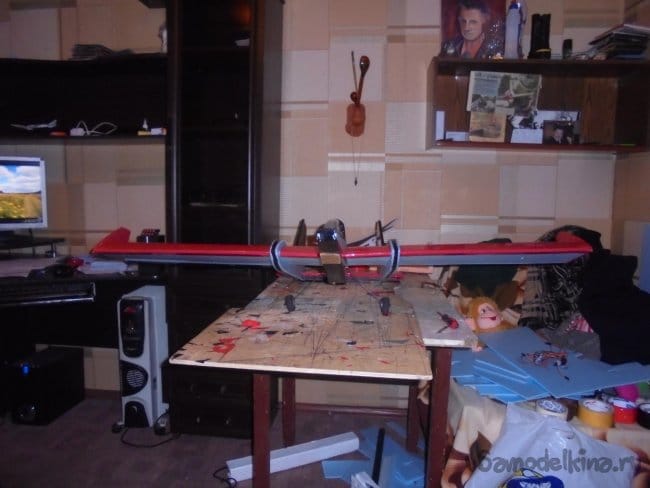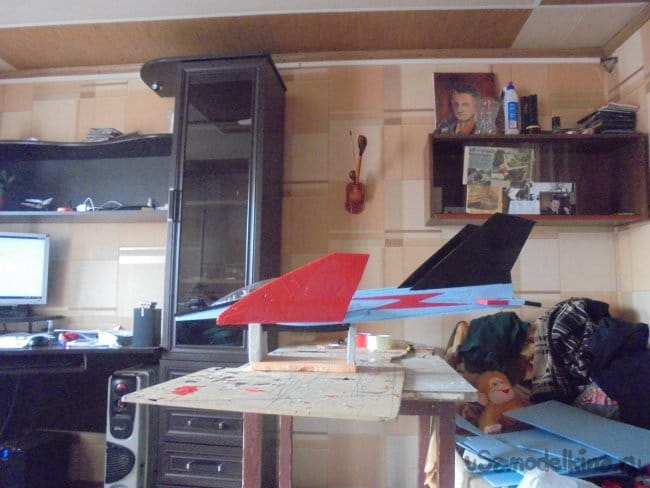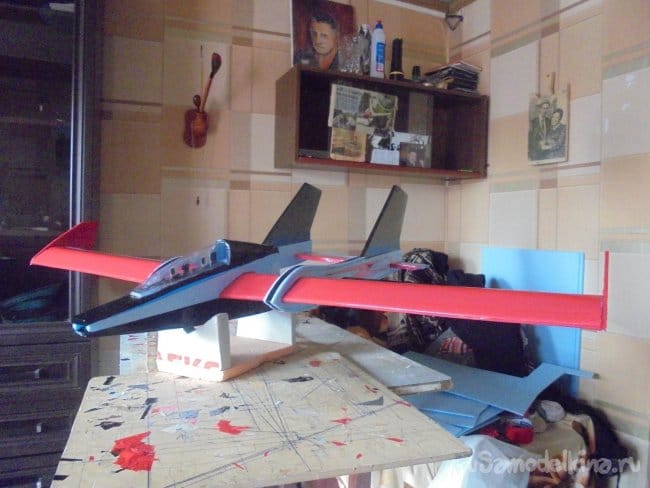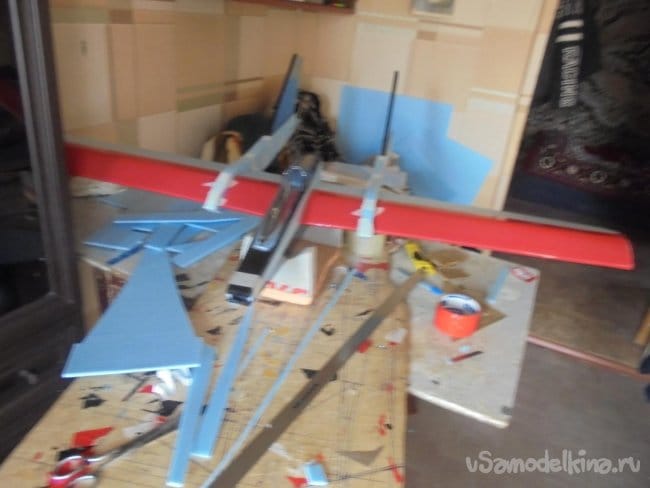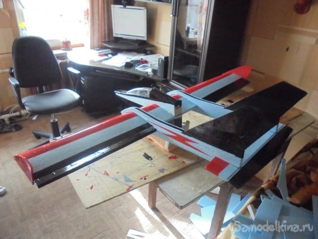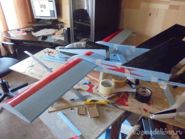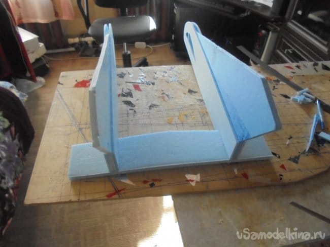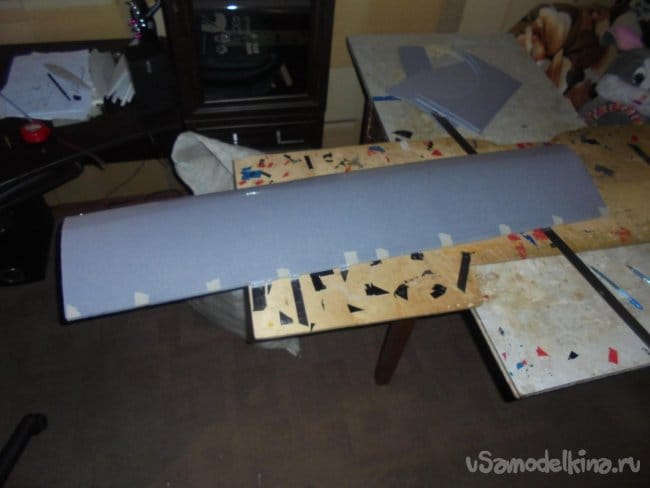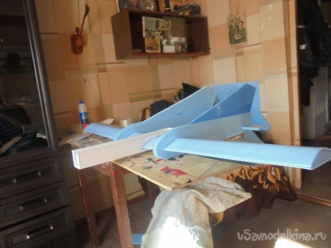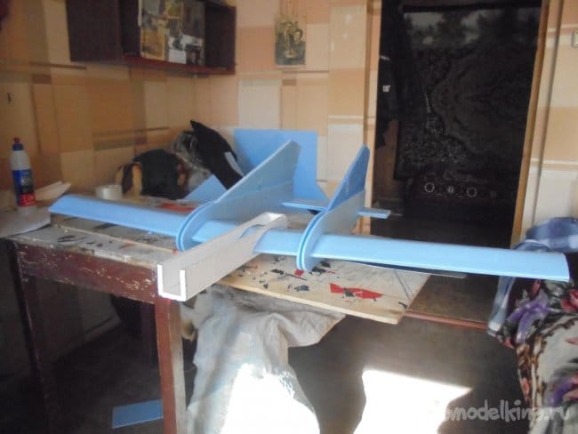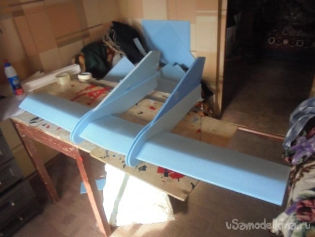 Для фюзеляжа хотел использовать технологическую пенопластовую упаковку для предохранения дверей при транспортировке. Но она показалась мне очень хрупкой, и я решил делать фюзеляж из подложки.