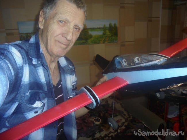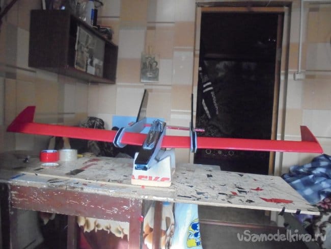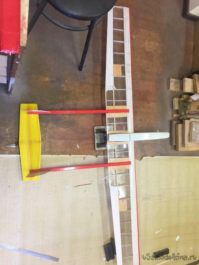 На нижней поверхности фюзеляжа вклеил два кусочка оргалита (ДВП) – 40 Х 60 мм. Для крепления шасси. Пока установил только колёса в ЦТ модели. Можно поставить ещё и переднюю стойку шасси, будет ли в этом необходимость, покажет первый полёт.
