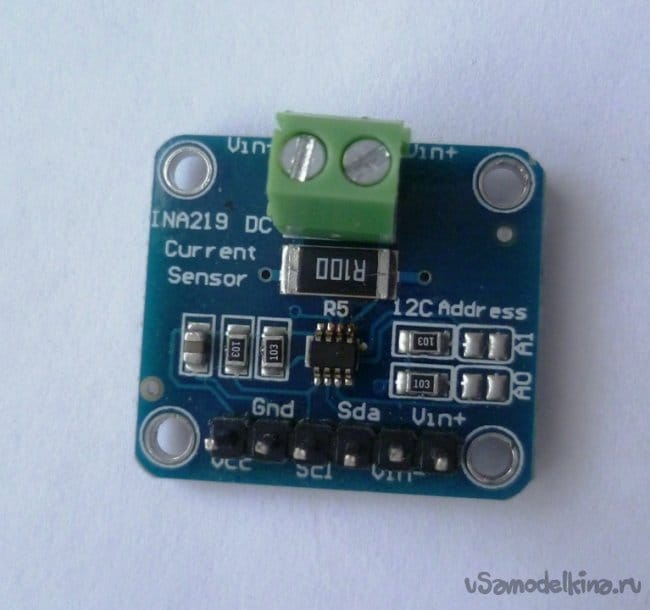 Основой модуля индикации является датчик напряжения и тока типа INA219 приобретенный на Алиэкспресс. Эта платка рассчитана на измерение значений напряжения до 26 В и значений тока до 3,2 А. Все измеренные параметры по шине I2C передаются на Ардуино. Этот датчик определяет сразу несколько параметров: мощность и емкость в мА\ч, ток и напряжение.