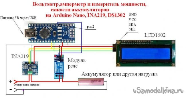 В основу прибора будут входить собственно сам датчик INA219, плата Arduino (можно применить любой вариант- Uno, Nano, Pro Mini), двухстрочный экран LCD1602 с платой интерфейса I2C, модуль реле на 5В.