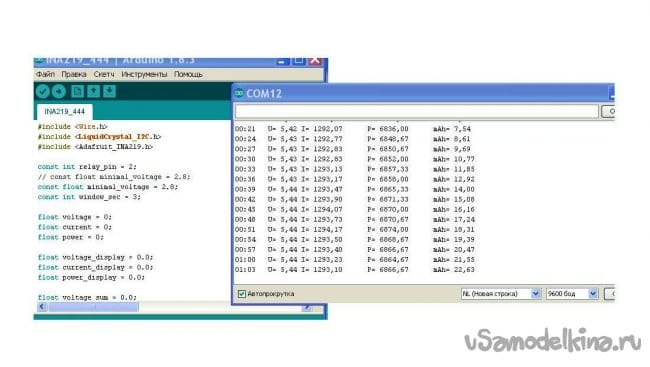 Чтобы определить емкость аккумулятора нужно подключить его в качестве источника перед INA219, а на выходной провод подключить нагрузку(например автолампу). В скетче устанавливается нижний предел отключения нагрузки 2,8 Вольт-значение надо подобрать по даташиту ваших аккумуляторов. При достижении напряжения 2,8 Вольта реле отключит нагрузку и на дисплее увидим реальную емкость аккумулятора в в миллиамперчасах. Чтобы опять включить прибор в работу надо сбросить питание 5 Вольт на Ардуино или установить кнопку сброса на контакт RST платы Ардуино и GND.