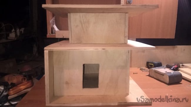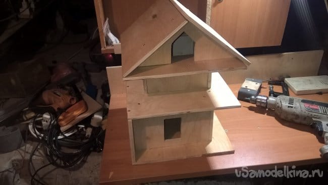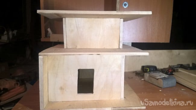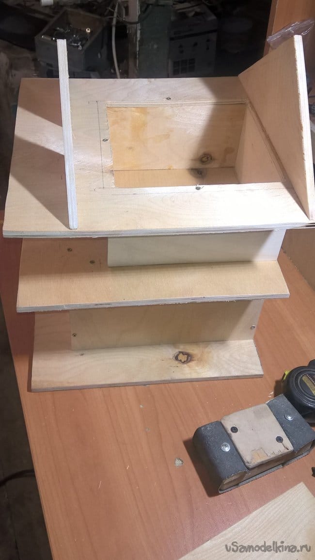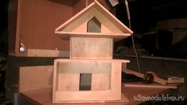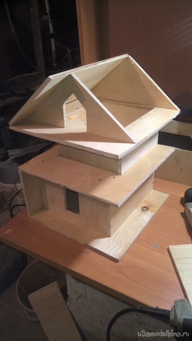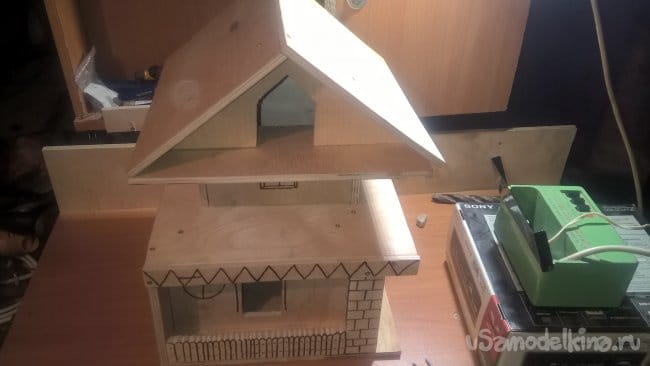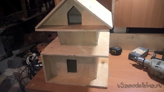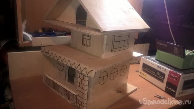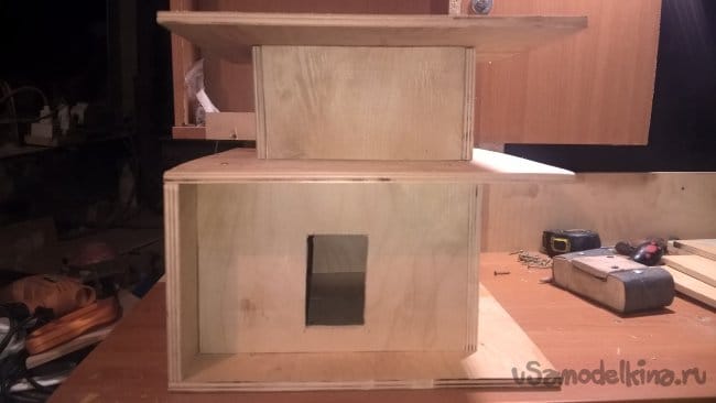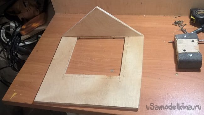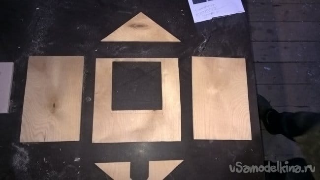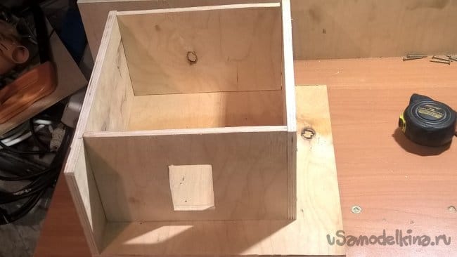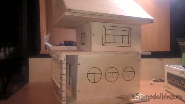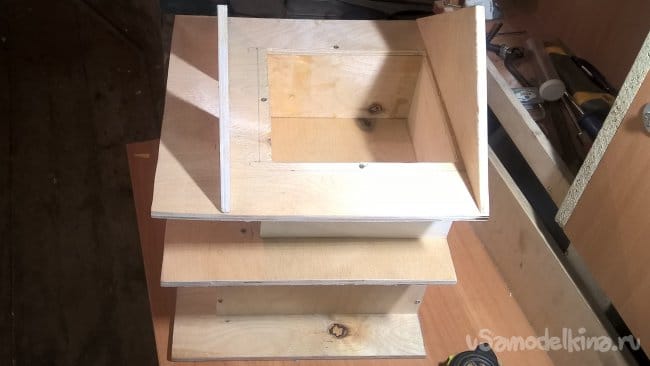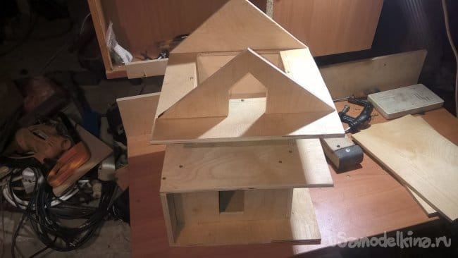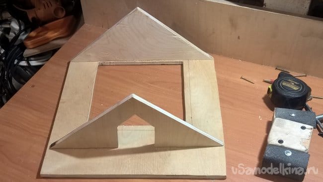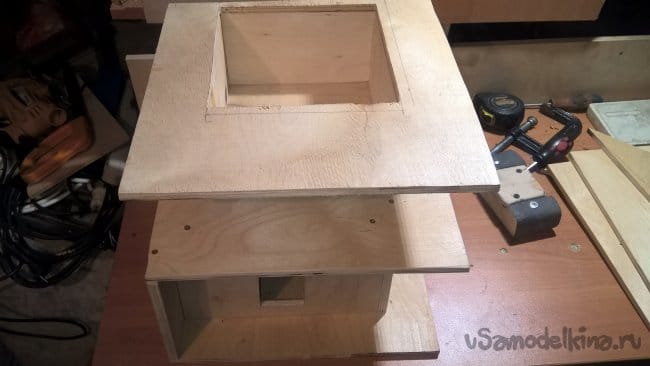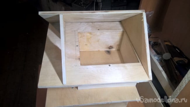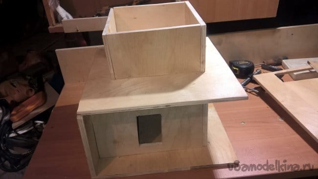 Вырезал в одном из дне прямоугольник (размеры 240х240 мм) для того чтобы соединить крышу и второй этаж