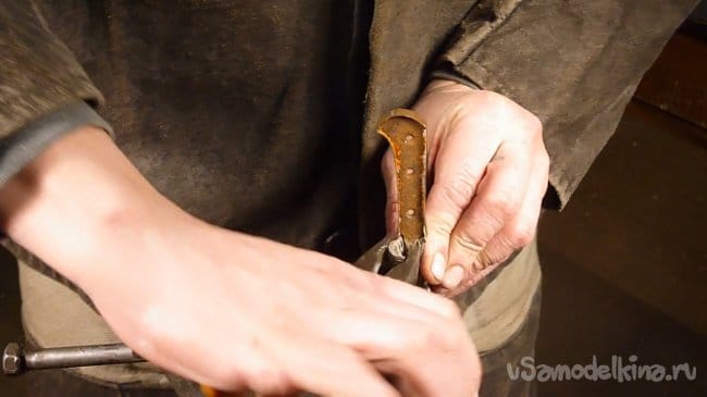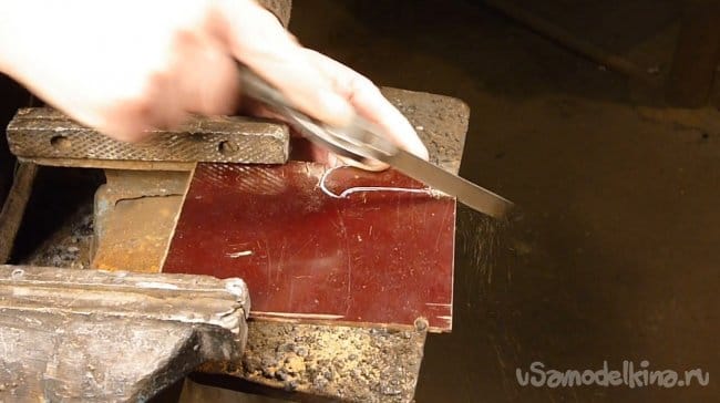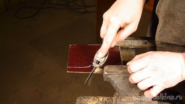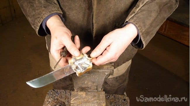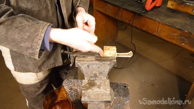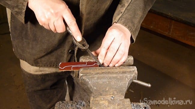 Зажимаем клинок в тиски и придаем форму гюльбанду, сначала напильником, потом надфилями.