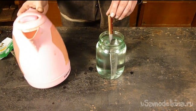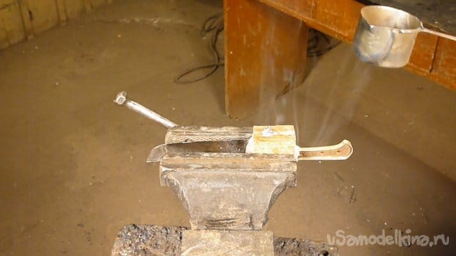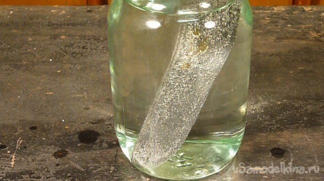 Ждем пока закончится реакция. Периодически вынимаем нож и аккуратно стираем образовавшийся налет. После окончания оксидирования промываем клинок и смазываем его маслом, для полного прекращения реакции.