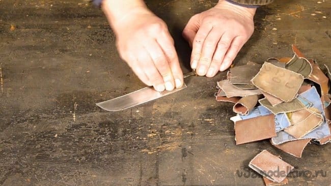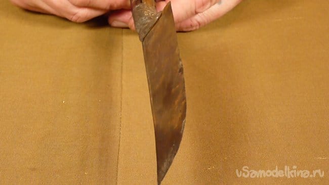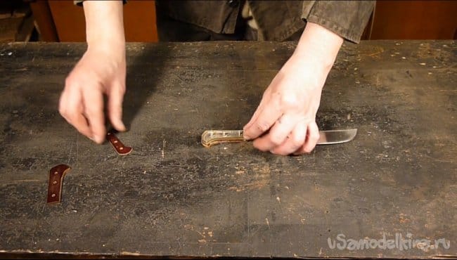 При разборке выяснилось, что внутренние вставки в рукояти сделаны из картона, заменим их на вставки из текстолита. Но сначала попытаемся выровнять лезвие и привести его в надлежащий вид.
