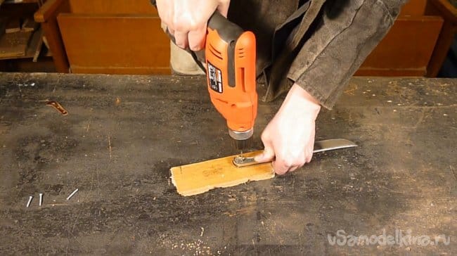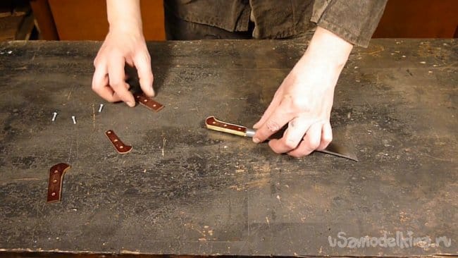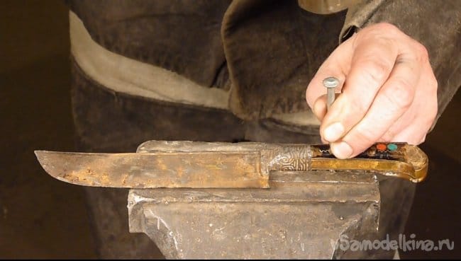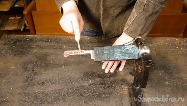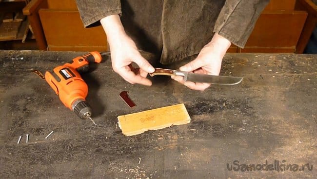 Для начала разберем рукоять ножа. Для этого выбиваем старые алюминиевые заклепки. Сорвать их с места можно при помощи дюбеля от строительного пистолета а окончательно выбить велосипедной спицей.