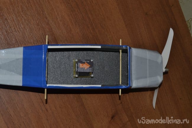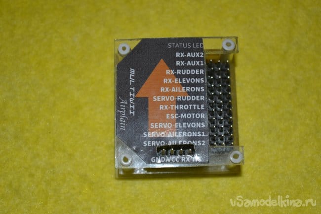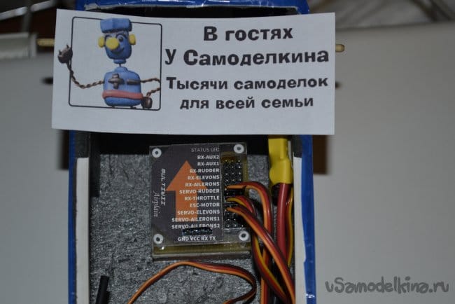 Легко делается, мало весит, просто и надежно. Его уже удобно монтировать в фюзеляж самолета, приклеив ко дну пару полосок "автомобильного" двухстороннего скотча. Но для полной картины нужен еще шильдик, который подскажет через пол года, когда уже надцать других схем будет собрано, что куда подключать.