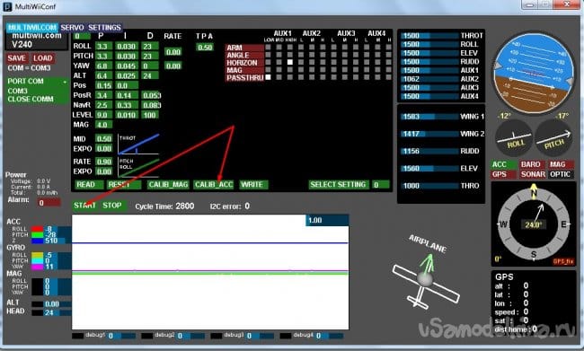 Выбираем его. Теперь нужно откалибровать акселерометр. Жмем кнопку READ и если все правильно - можем наблюдать показания с датчика в реальном времени. Кладем устройство на ровную поверхность и жмем CALIB_ACC. Обычно "ровная поверхность" это стол рядом с компьютером, так что когда жмете калибровку - руки от стола подальше. Кто не помнит, акселерометр - это датчик ускорения. Так что любые колебания или вибрации на калибровке положительно сказываться не будут. Но по возможности лучше все же калибровать на выставленной по уровню поверхности. Гироскоп калибруется сам при каждом включении, так что его калибровать не нужно. Единственное - при включении модель должна располагаться в неподвижном состоянии. То есть кладем модель на землю, включаем и не трогаем. Сразу происходит калибровка гироскопа. О калибровке сообщает светодиод, подписанный как STATUS.