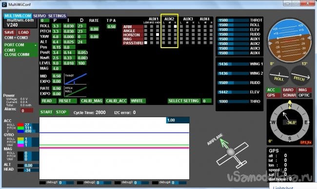 Так же на канале AUX2 нужно настроить арминг. Арминг - термин коптерный. По человечьи это называется разблокировка двигателя. На самолетах это обычно реализуется через аппаратуру управления, но т.к. этот контроллер изначально коптерный - тут это сделали довольно жестко. В общем вешаем на AUX2 какой-то свободный тумблер, в программе ставим ARM на высокий уровень. Тут кто-то может захотеть схитрить и выставить разблокировку на всех уровнях AUX2, вот только не проканает. В таком случае мультивий откажется запускать двигатель вообще. Можно предположить что это баг, но я думаю что скоре защита. Самолет все таки только вперед летит, а куда рванет неуправляемый коптер одним Богам известно.