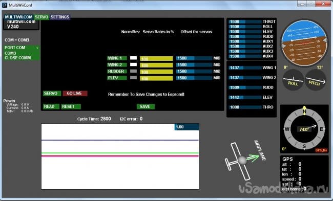 Во вкладке SERVO можно произвести реверс сервомашинок, если это необходимо. Тут сделали как-то мудрено. Для начала нужно нажать SERVO. Появиться список сервомашинок и уровни. Если сейчас нажать на клавишу реверса и попытаться сохранить - ничего не сохраниться. Сначала нужно нажать GO LIVE, после чего при отклонении стиков можно будет наблюдать отклонение уровней в окне. Теперь нажимаем на кнопку реверса нужного канала и уже после этого жмем SAVE. Теперь все записалось.