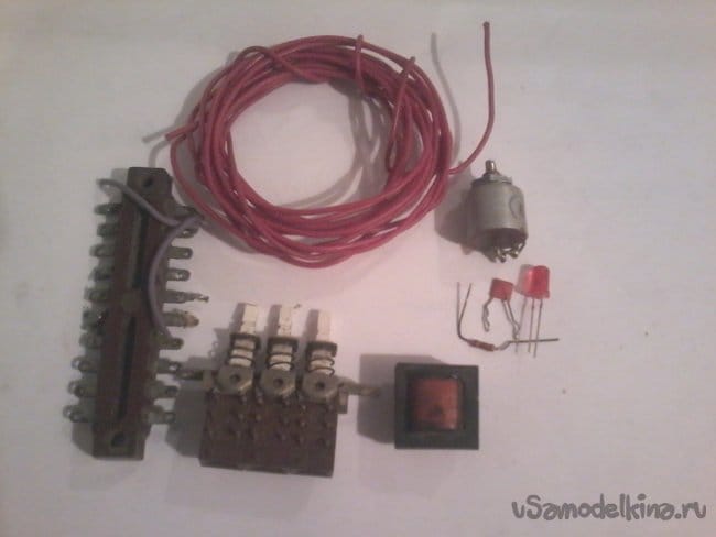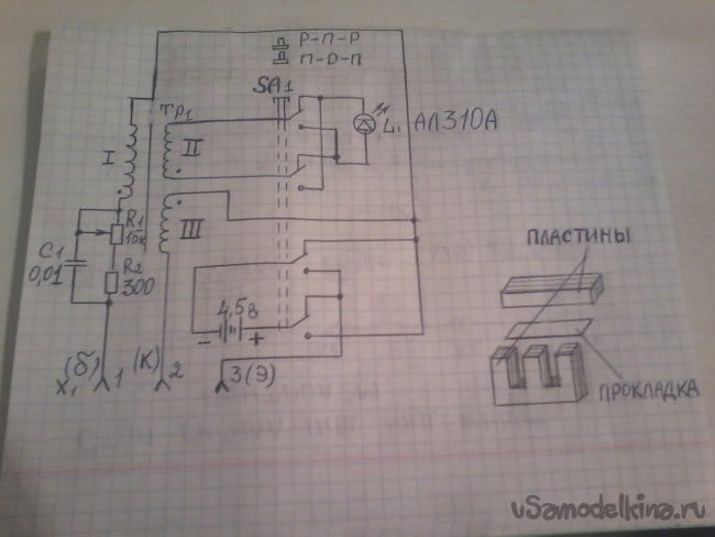 1 – выходной трансформатор радиоприемника «Альпинист» или любой другой с магнитопроводом Ш 6 х 8 мм; кнопочный переключатель с четырьмя группами контактов; светодиод АЛ 310А, подойдут и другие с током потребления до 20 мА, переменный резистор типа СП -0,5, или СП -1 на 15 ком, резистор МЛТ -0,125 вт на 300 ом; конденсатор 0,01 мкф.