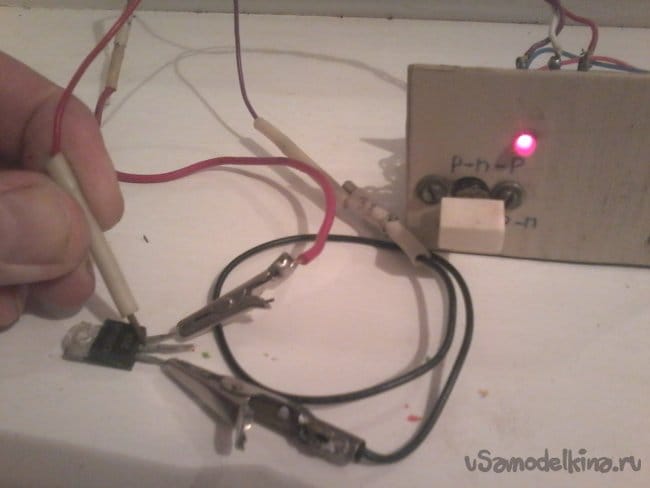 Подсоединяем к зажимам 1, 2 и 3 соответственно - базу, коллектор, и эмиттер проверяемого транзистора. Подаем питание 4,5 в на прибор. Переключателем SA 1 устанавливаем нужную структуру проверяемого транзистора, вращая движок переменного резистора добиваемся свечения светодиода. Если транзистор исправен, то должен загореться светодиод, а если неисправен – то светодиод не горит.